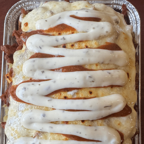 Geserveerd met een pita, salade, patat of aardappelschijfjes en 2 sauzen naar keuze