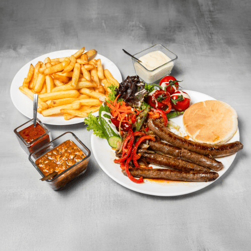 Al onze schotels worden geserveerd met verse salade, gebakken aardappels, frites of rijst, diverse sauzen en 1 pita broodje